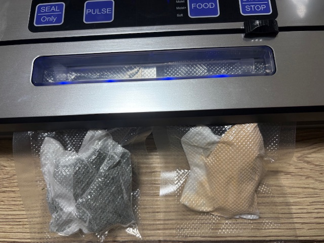 10cm×15cmの真空パックの袋にお茶パック2袋がちゃんと入ります。機種によっては出来ないことがあるかもしれませんが、2個同時に真空にすることも可能です。(ちなみにこちらはアオサと一緒にきな粉も真空にしています。)